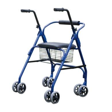 Deambulatore pieghevole a 4 ruote, Deambulatore rollatore con altezza regolabile, sedile e schienale imbottito e cestino metallico porta-oggetti. Le quattro gambe del deambulatore poggiano su 4 doppie ruote, con le anteriori piroettanti e le posteriori fisse, dotate di sistema a pressione di auto-bloccaggio.