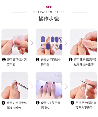 4. Tagliare il superluo adesivo per unghie lungo il bordo libero, quindi limare il bordo tagliato con una lima per unghie. Suggerimenti: continuare a limare a senso unico verso il basso di 45 pollici di angolo. 5. Per rendere gli adesivi più resistenti, si prega di utilizzare la lampada LED per unghie per più di 30 secondi. 6. L'arte nall è fatta. Suggerimenti: non immergere le dita in acqua tiepida entro il primo giorno dall'utilizzo degli adesivi per unghie.