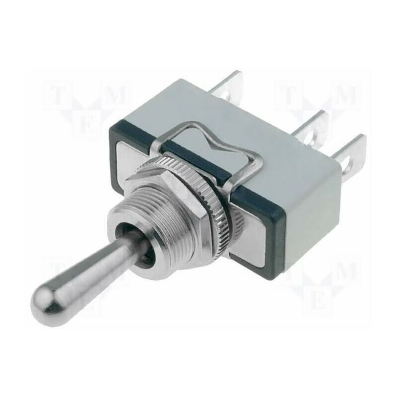 Interruttore a levetta unipolare ON-OFF-MOM, corrente 15A-10A, voltaggio 250V-400V, corpo in poliestere, leva in ottone nichelat
