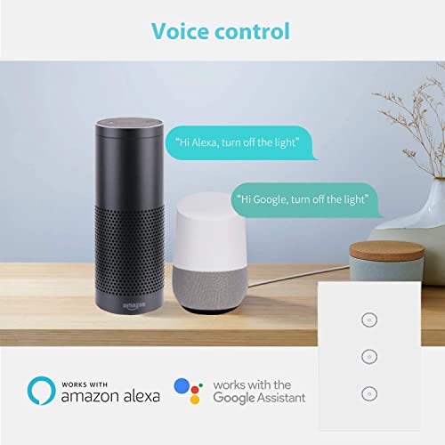 Interruttore luce compatibile Alexa: supporta il controllo vocale, l'interruttore a parete intelligente compatibile con Amazon Alexa, Echo Dot e Google Assistant. Accendi / spegni le luci con i comandi vocali. Salva te stesso lo sforzo del pulsante di stampa soprattutto quando le tue mani sono piene. La vita diventa più facile