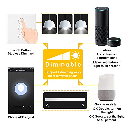 Interruttore Smart Dimmer Interruttore Wi-Fi Interruttore a parete a sfioramento Touch Lavora con Alexa / Google Home / IFTTT 1 Gang APP Telecomando, funzione di temporizzazione, protezione da sovraccarico AC 100-240V Massimo 400 W per Android iOS (linea neutra richiesta) (4 Pack)