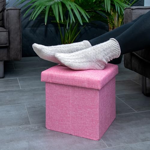 INTIRILIFE Pouf Pieghevole 30x30x30 cm in Rosa CILEGIA - Cassapanca Cubo Contenitore Imbottito de Tessuto a l'Ottica Lino con Coperchio - Ottomane Poggapiedi Sgabello Panca Poltrona