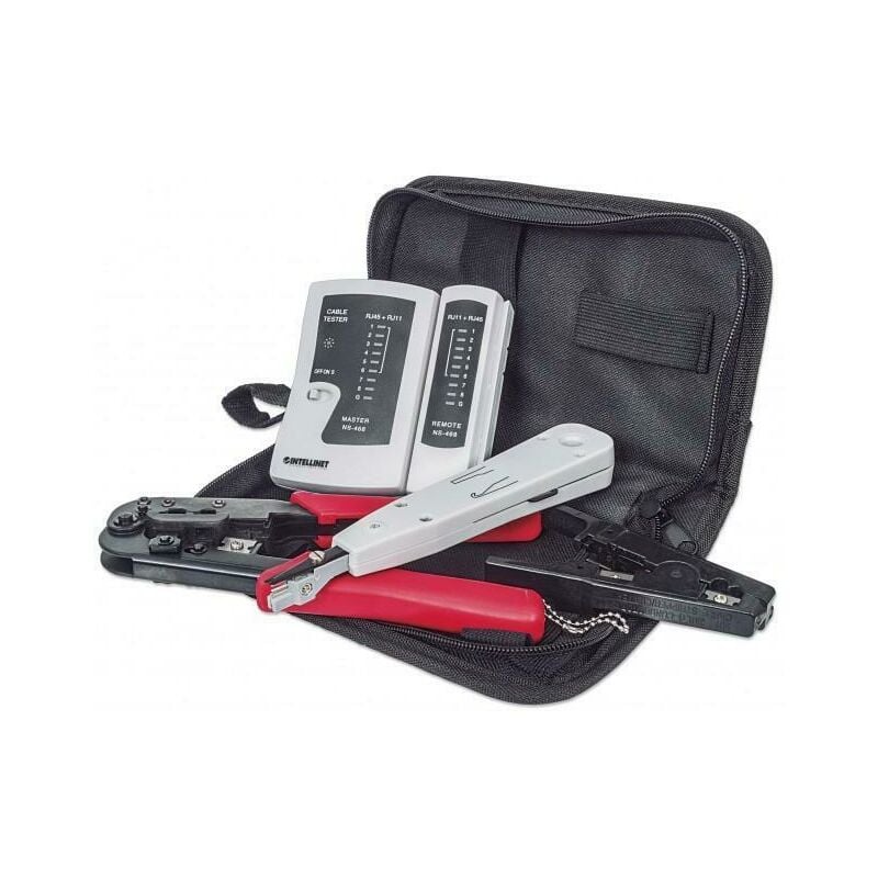 Set composto da 4 utensili indispensabili per la diagnostica, il test o la realizzazioni di nuove reti network Il set e' costituito da: - Tester LAN per cavi RJ11/12/45, ogni cavo viene automaticamente verificato, display separato per pin 1-8 e terra (batterie non fornite) - Pinza di crimpatura RJ11 / RJ12 / RJ45 per installazioni professionali - Inseritore IDC, per una rapida e professionale installazione IDC - Strapperina per cavi indicata per tagliare e sguainare i cavi