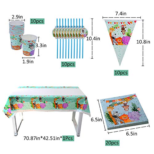 PACCHETTO DI VALORE ALL-IN-ONE - Per 10 persone include 62 pezzi - 10 tazze di animali, 10 pezzi di piatti da 7 pollici, 10 pezzi di piatti da 9 pollici, 20 tovaglioli, 10 pezzi, 1 striscione di compleanno e 1 copritavolo.