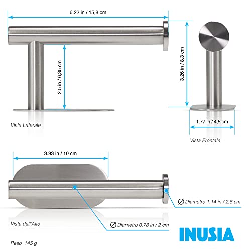 Inusia - Porta Carta Igienica Adesivo per Bagno e Toilette Portarotolo in Acciaio Inox Antiruggine Satinato Opaco Senza Foratura con Biadesivo 3M Ultra Resistente per tutte le Superfici