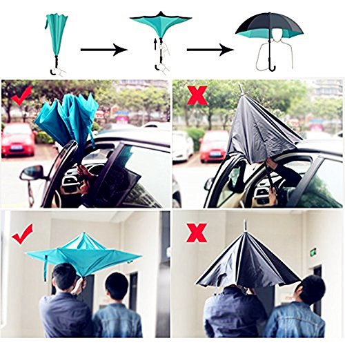 Design a doppio strato: design innovativo permette di chiudere l' ombrello e metterlo direttamente in qualsiasi punto della stanza o auto mentre non hai bisogno di preoccuparsi per rendere il sedile o pavimento bagnato. Nessuna preoccupazione circa l' umido quando stand sull' autobus o in metropolitana. Evita efficacemente la flebo permeazione che avviene su tessuto più uno strato ombrelli, ti protegge bene contro il vento e sole.