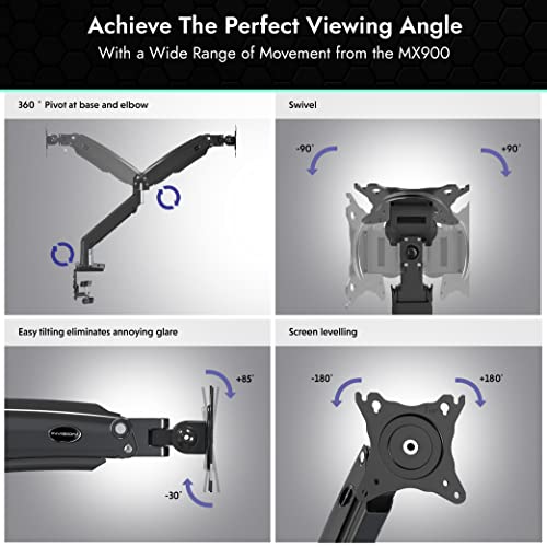 AMPIO RANGE DI MOVIMENTO CON BENEFICI PER LA SALUTE E MAGGIORE PRODUTTIVITÀ - La regolazione del monitor per il massimo comfort ergonomico aiuta a ridurre i rischi legati alla postura. MX900 offre la soluzione perfetta, fornendo una maggiore gamma di regolazioni in altezza e in portata, dandoti una gamma più ampia di angoli di visione. La corretta impostazione della postazione di lavoro e dello schermo può avere un enorme impatto positivo sulla produttività, sulla salute e sul benessere