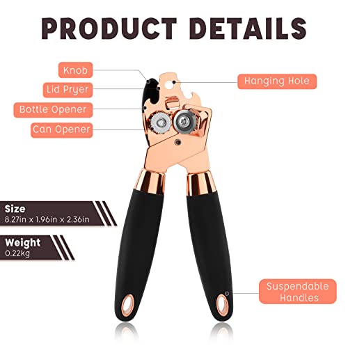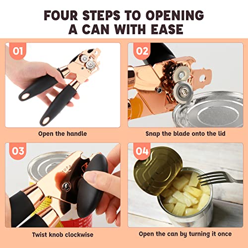 Ioensy Apriscatole 3 in 1 apriscatole in acciaio inox con lama affilata e manopola di giro, apriscatole antiscivolo, per mani di artrite, anziani, chef nero (oro rosa)