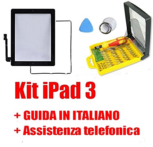 IPad 3: kit completo sostituzione (vetro touch nero + biadesivo + home + guarnizione + cornice fotocamera + Nuovo set Attrezzi + GUIDA IN ITALIANO) GSM e WI-FI A1403 A1416 A1430