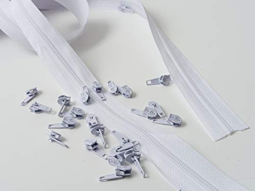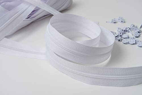 IPEA Cerniera Lampo misura 3 Catena Continua - 10 Metri - Corda in Nylon + 25 Cursori inclusi - Zip - Tagliabile per Cucito, 3 Colori a Scelta, Bianco B, Larghezza 30 mm