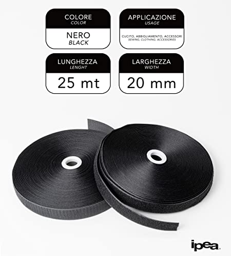 IPEA Nastro a Strappo da Cucire da 20 mm Nero, Ben 25 Metri di Lunghezza, Nastro da Cucito (Non Adesivo) Striscia Extra Forte per Arredamento Casa Vestiti Abiti - Corda Gancio e Anello