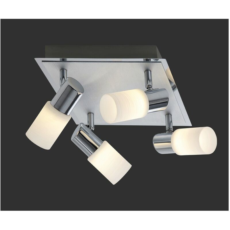 Faretto Quadrato Clapton 4 Spot Led Cromo E Vetro Bianco 23x23 cm Il faretto Clapton di Trio Lighting è composta da una piastra quadrata in metallo e 5 spot a cono in vetro opaco bianco spazzolato orientabili. Dotata di modulo led integrato 4 x SMD LED 4,3 watt, 430 lumen, 3000k luce calda. Ideale per illuminare e arredare diverse zone della vostra casa che necessitano un'illuminazione diretta in un punto di interesse. Perfetta ad esempio per l'ingresso, il corridoio o anche la zona living. Caratteristiche: Dimensioni: 23x23 cm