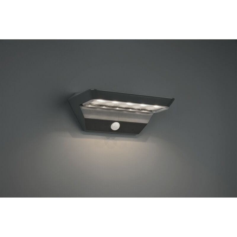Lampada da Parete Led per Esterno con Sensore Movimento La lampada da parete Mendoza di Trio Lighting è composta da una struttura rettangolare in plastica di colore antracite con Led e sensore di movimento integrato. Protezione contro spruzzi d'acqua provenienti da qualsiasi direzione (IP44). Sorgente luminosa a LED SMD da 5 watt, resa luminosa 200 lumen, temperatura colore 3000k (luce calda). Questa applique funziona tramite batterie ricaricabili alimentate da energia solare. L'apparecchio ha una luce di orientamento permanente che si illumina automaticamente ad una luminosità di circa il 10% al crepuscolo o al buio. La luce passa al 100% in caso di movimento nelle immediate vicinanze. Durata della luce e sensibilità regolabili. L'ottima impermeabilità e qualità costruttiva permettono la collocazione in qualsiasi tipo di ambiente esterno come ad esempio balconi, terrazze, garage, ingressi e zona giardino. Caratteristiche: Struttura rettangolare in plastica di colore antracite Sensore