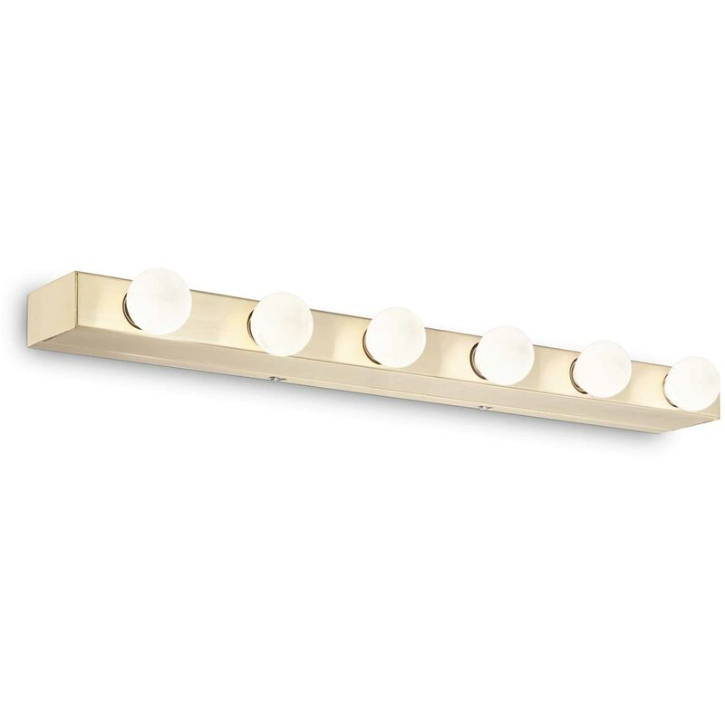 Lampada da parete ottone L 605 x H 40 x P 80 mm Caratteristiche: Lampadina inclusa=No Kit fissaggio=No Attacco lampada=E14 Volt=220-240 V AC Watt=E14 max 6 x 40W Finitura=ottone Colore rosone=ottone Materiale=Metallo Dimensioni= L 605 x H 40 x P 80 mm