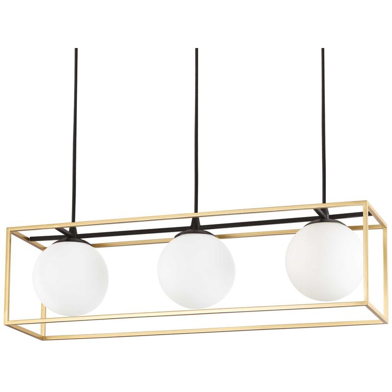 Lampada a sospensione ottone L 700 x H min 445 - max 1450 x P 185 mm Caratteristiche: Lampadina inclusa=No Kit fissaggio=No Attacco lampada=E14 Volt=220-240 V AC Watt=E14 max 3 x 40W Finitura=ottone Colore rosone=nero Materiale=Metallo,Vetro Dimensioni= L 700 x H min 445 / max 1450 x P 185 mm