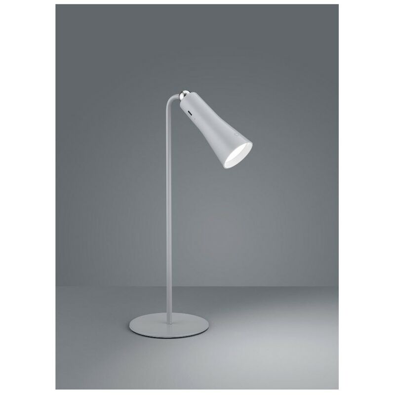 Lampada da Tavolo Componibile Grigia con LED Touch Dimmer e Batteria La lampada da tavolo MAXI di Trio Lighting presenta una struttura componibile in metallo di colore grigio con base rotonda, fusto lineare sottile e diffusore conico. Sorgente luminosa a LED integrato da 2 watt, ottima resa luminosa 200 lumen, temperatura colore 3000k (luce calda). Grazie alla funzione touch dimmer integrata é possibile regolare l'intensità della luce in modo graduale a diversi livelli tramite un semplice tocco. Dotata, inoltre, di batterie ricaricabili che consentono di spostare la lampada in base alle vostre esigenze senza l'ingombro di fili. Una lampada minimal dal design moderno, ideale per illuminare scrivanie, tavoli e comodini di uffici, camerette, studi o stanze da letto. Caratteristiche: Colore: Grigio Sorgente luminosa: LED integrato da 2 watt Resa luminosa: 200 lumen Temperatura colore: 3000k (luce calda) Funzione touch dimmer integrata Batterie ricaricabili Design moderno e minimal Ideale