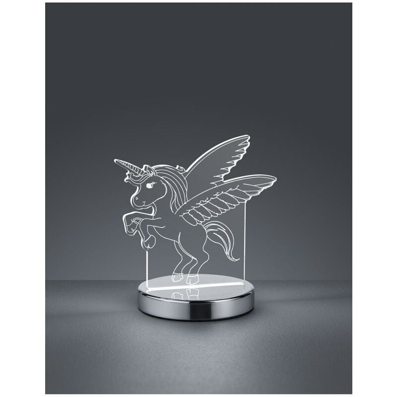 Questa lampada da tavolo della collezione KARO di Trio Lighting è composta da una base rotonda in metallo cromato e diffusore in acrilico trasparente a forma di unicorno, interruttore a filo incluso. Fonte luminosa SMD LED 7 watt, 400 lumen, 3000k + 4000k + 6500k (luce calda, fredda e naturale). Il colore della luce e la sua dimmerabilità sono regolati gradualmente grazie al dimmer integrato. Non compatibile con dimmer esterno. Una lampada che si distingue per il suo design moderno e giovanile, ideale per la cameretta dei ragazzi o per la vostra zona living.