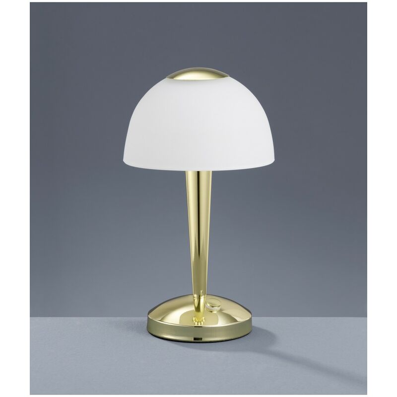 Lampada da Tavolo Ventura LED Touch Ottone e Vetro Bianco Ø15 cm La lampada da tavolo VENTURA di Trio Lighting presenta una struttura cilindrica in metallo finitura ottone lucido e diffusore a fungo in vetro satinato bianco, sensore touch integrato alla base. Disponibili anche la variante di finitura nichel opaco. Sorgente luminosa a LED SMD da 4 watt, 350 lumen, 3000k (luce calda). Grazie al sensore touch questa lampada può essere accesa a 3 diversi livelli di luminosità. Una lampada da tavolo semplice e versatile, perfetta sia per illuminare sia come complemento d'arredo per la vostra casa in stile moderno, da collocare ad esempio nella zona living, nella sala da pranzo o nella camera da letto.