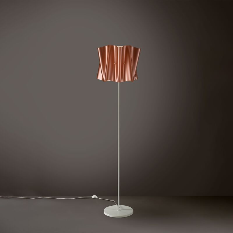 Piantana base e stelo in metallo FOLIO paralume Rame diametro 40x h164 cm Lampada disegnata dal design studio di MM Company, formata da un' anima cilindrica in Polilux con una seconda superficie curva che ricrea l'effetto di un tessuto. Specifiche Modello FOLIO Piantana base e stelo in metallo Paralume color Rame Copper Una luce x Max 30W E27 Cavo standard trasparente 300 cm Dimensioni Diametro 40 cm Altezza 164 cm.