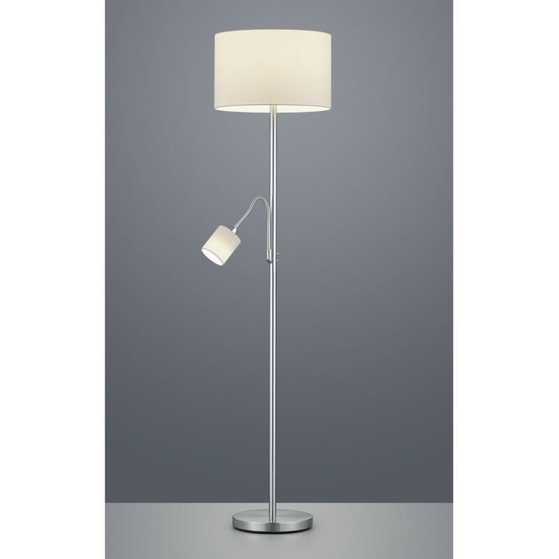 Piantana Nichel con Paralume Tessuto Bianco e Spot Lettura La piantana Hotel di Trio Lighting presenta una base rotonda, un fusto lineare sottile in metallo finitura nichel opaco, paralume rotondo in tessuto bianco e spot da lettura con braccio flessibile, interruttore a pedale incluso. Dotata di alloggio per lampadina E27 max 60 watt per la fonte di luce principale e un alloggio per lampadina E14 max 18 watt nello spot (lampadine acquistabili separatamente). Le due fonti di luce possono essere accese e spente indipendentemente le une dalle altre grazie a interruttori separati. Una lampada da terra dal design minimalista ma al tempo stesso elegante, ideale per essere collocata in diverse stanze della vostra casa arredata in stile moderno, ad esempio per la zona living, ma anche per contesti ricettivi, come stanze di alberghi o di hotel. Disponibili anche altri articoli della stessa serie.
