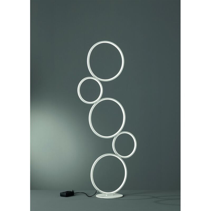 Piantana LED Rondo 5 Cerchi Bianco H115 cm La piantana della serie RONDO di Trio Lighting è composta da una struttura in metallo con 5 diffusori a forma di cerchio finitura bianco opaco, interruttore a pedale incluso. Dotata di modulo LED integrato da 36w - 3200lm - 3000K luce calda. Grazie alla sua dimmerabilità é possibile regolare l'intensità della luce tramite il dimmer integrato. Non compatibile con dimmer esterno. Un elemento dal design originale che non passa inosservato, ideale per illuminare e al contempo arredare con originalità ambienti in stile moderno, perfetto per il salotto, la zona living o la camera da letto. Disponibile anche la variante di finitura nero opaco. Caratteristiche: Struttura in metallo 5 diffusori a forma di cerchio Finitura bianco opaco Interruttore a pedale incluso Modulo LED integrato da 36w - 3200lm - 3000K luce calda Dimmer integrato Non compatibile con dimmer esterno Design originale Ideale per ambienti in stile moderno Disponibile anche in