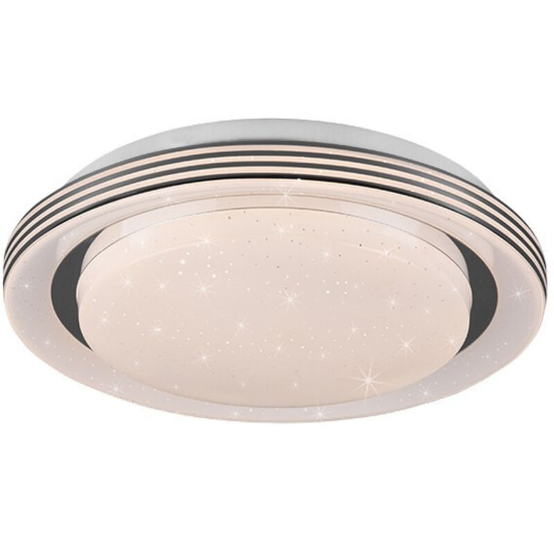 La lampada da soffitto ATRIA di Trio Lighting ha una struttura rotonda realizzata interamente in plastica bianca con diffusore effetto stelle glitterate. Dotata di modulo led integrato SMD LED 10,5 watt, 1080 lumen, da 3000k a 6500k (luce calda, fredda e naturale). L'intensità della sua luminosità ed il colore della luce (gradi Kelvin) sono regolati tramite dimmer integrato attivato da telecomando in dotazione. Non compatibile con dimmer esterno. L'effetto cielo stellato insieme alla funzione luce notturna rendono questa plafoniera unica e affascinante. L'accensione, lo spegnimento e le diverse impostazioni di questo articolo vengono facilmente gestite a distanza tramite il pratico telecomando in dotazione. Inoltre, la funzione di memorizzazione salverà l'ultimo settaggio per ogni prima accensione dell'apparecchio. Un elemento moderno ed all'avanguardia, perfetto per diverse zone della vostra casa, come ad esempio il soggiorno living, la camera da letto o il salone. Disponibili anche