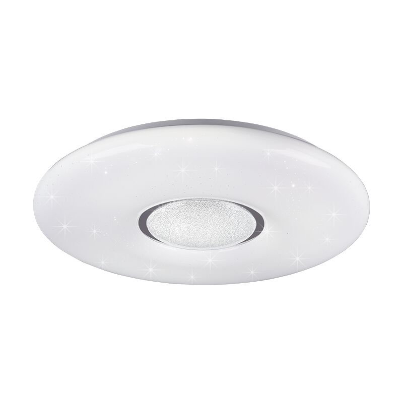 Plafoniera Moderna con Effetto Cielo Stellato LED Dimmer RGB La lampada da soffitto LIA di Trio Lighting ha una struttura circolare realizzata interamente in plastica bianca. Dotata di modulo SMD LED integrato da 20 watt, resa luminosa 2400 lumen, temperatura colore 3000k - 6000k (luce calda, fredda e naturale). L'intensità luminosa è regolabile tramite dimmer integrato attivato dal pratico telecomando in dotazione, mentre il dispositivo RGBW di cui é dotata permette di variare infinitamente il colore della luce. Colore della luce infinitamente variabile in modo graduale. Non compatibile con dimmer esterno. Grazie alla funzione di memorizzazione, inoltre, l'ultimo settaggio verrà impostato alla prima accensione utile dell'apparecchio. L'effetto cielo stellato e l'impostazione luce notturna rendono questa plafoniera unica e affascinante, inoltre l'innovativa tecnologia WIZ consente impostazioni all'avanguardia gestite con semplicità. Un elemento dal design moderno, pratico e versatile
