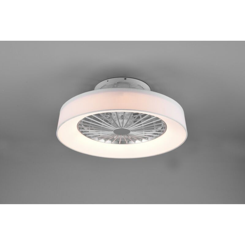 Ventilatore Moderno Luce Led 30w Dimmerabile Farsund Bianco FARSUND di Trio Lighting è un ventilatore da soffitto rotondo con struttura in plastica bianca e diffusore in tessuto in tinta con la struttura, diametro 47 cm. Dotata di modulo led integrato SMD LED 30 watt, resa luminosa 2200 lumen, 3000k - 6500k (luce calda, fredda e naturale). Dimmer integrato. Tramite il pratico telecomando in dotazione è possibile accedere a diverse funzioni come la regolazione di intensità e temperatura colore della luce (3000k - 4000k - 6500k), l'attivazione luce notturna e il timer per l'accensione/spegnimento automatico in orari prestabiliti. Non compatibile con dimmer esterno. La velocità delle pale può essere impostata a 3 diversi livelli. Dal design moderno e dalle molteplici funzioni, questo ventilatore oltre a raffrescare l'ambiente permette di illuminare la stanza in modo totalmente personalizzato, perfetto per la camera da letto, il soggiorno living ma anche per la ventilazione di locali