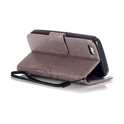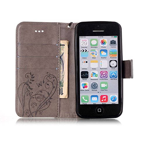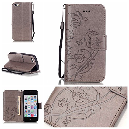 Per iphone 5c Custodia,Funyye Per iphone 5c Pelle Libro Copertura Con Cordino Shell Supporto Stand Porta Carte Portafoglio Flip Wallet Cover Chiusura Magnetica Proteggi Caso Elegante Fiori e Farfalle -Grigio