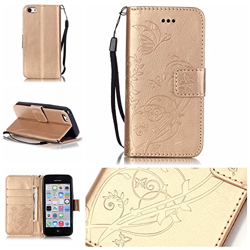 Per iphone 5c Custodia,Funyye Per iphone 5c Pelle Libro Copertura Con Cordino Shell Supporto Stand Porta Carte Portafoglio Flip Wallet Cover Chiusura Magnetica Protezione Caso Elegante Fiori e Farfalle -Dorato