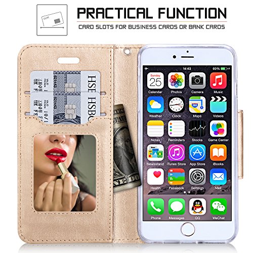 IPhone 6s Plus case, iPhone 6 Plus case, Fyy Premium custodia a portafoglio in pelle PU con specchio cosmetico e fiocco da polso per Apple iPhone 6S Plus/iPhone 6 Plus (14 cm), Ecopelle, Pink & Gold, 6 Plus / 6S Plus (5.5 inch)