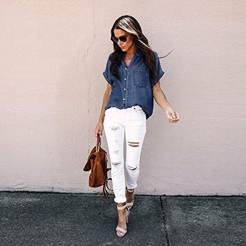 IQYU Camicia da donna a maniche lunghe, a maniche corte, in jeans, oversize, colore blu, estiva, camicetta da donna, camicetta da lavoro, maglietta a maniche corte, Blu scuro, XL