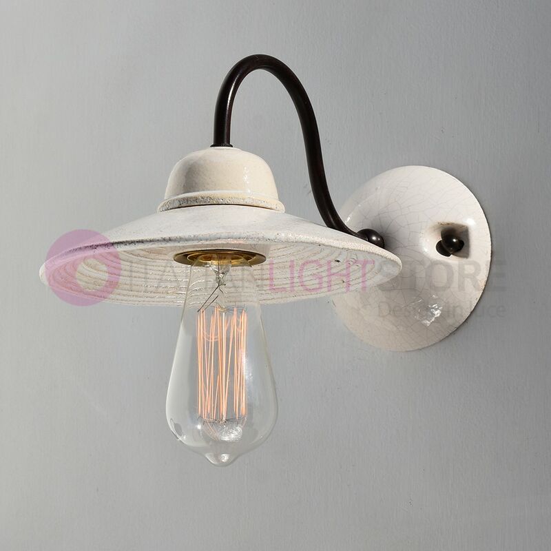 Applique da parete in ceramica anticata e braccio in ferro, stile Rustico Country. APPLIQUE A PARETE con braccio in ferro colorato e ceramica finitura bianco anticato. La lampada si inserisce con stile in ambienti rustici, rurali e country. Una particolare ed esclusiva lavorazione artigianale crea delle crepe, dei buchini, delle macchie nere sulla ceramica, dandogli un aspetto volutamente anticato e rovinato, e questo rende ogni pezzo un elemento unico e mai uguale agli altri;