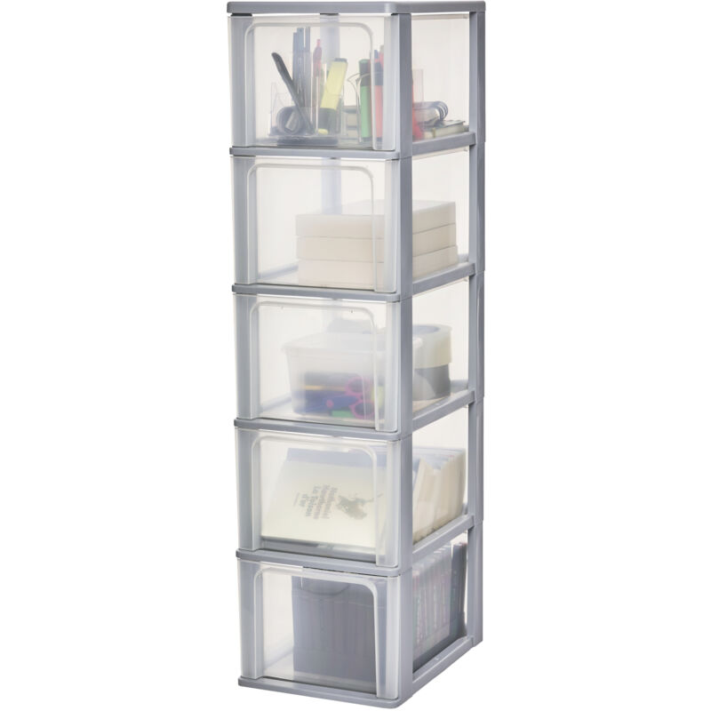 CONTIENT: 1 tour de rangement - Fabriqué en France ● DIMENSIONS: 26 x 35 x 99.5 cm (L x P x H) - Interne (tiroir): 31.5 x 21.5 x 18.4 cm (L x P x H) ●CAPACITÉ: 5 x 13 L ●DESIGN: le haut de la tour est conçu pour ranger les petits objets. Les arrêts de tiroir permettent d'éviter que ces derniers ne tombent. ● UTILISATION: Les tiroirs sont de taille A4, ce qui vous permet de stocker toutes sortes d'articles de bureau tels que du papier ou des classeurs. ●✔️ MATÉRIAU: Plastique transparent (polypropylène)
