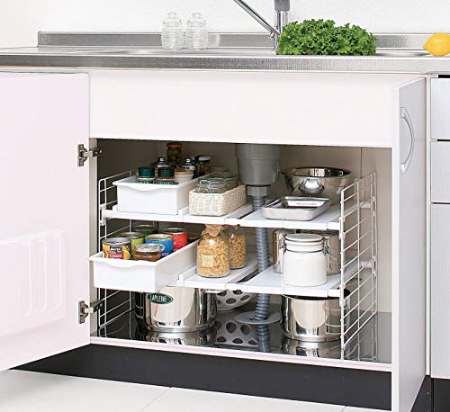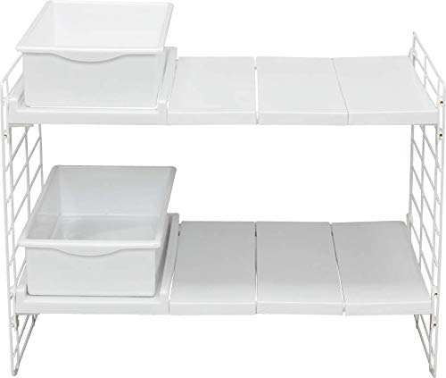 Iris Ohyama, Organizzatore per armadietti, sottolavello, estensibile, plastica per armadietti, dispensa, alimenti e utensili - Cestello telescopico a 2 livelli UMD-2V - Bianco
