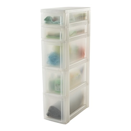 Iris Ohyama, Torre di stoccaggio, 5 cassetti (3 x 10 L + 2 x 4 L), con ruote, cassetti trasparenti, ufficio, bagno, soggiorno - New Slim Chest NSC-223 - Bianco