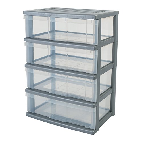 Iris Ohyama, Torre di stoccaggio, Organizer in plastica, 4 casseti da 34 L, Ruote, Materiale robusto, Ufficio, Garage, Camera da letto, Capannone - Ufficio, Garage - Wide Chest WC-N604 - Argento