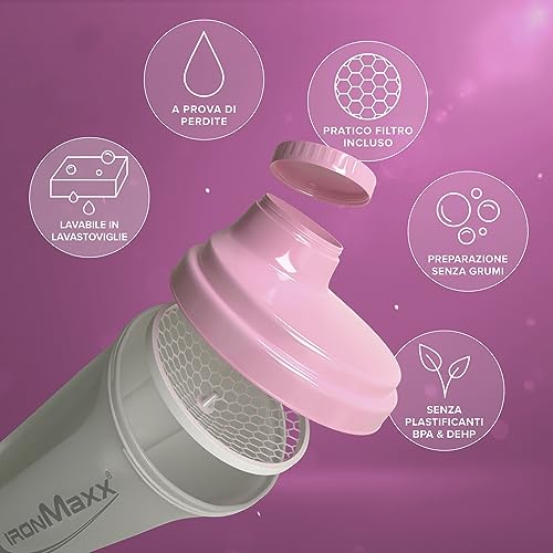 Cos'è incluso: 1 x IronMaxx Protein Shaker da 700 ml - Shaker Stabile con Setaccio per Frullati Proteici - Facile da Pulire - Colore Bianco Ghiaccio-Rosa