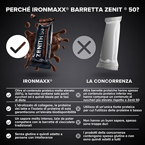 : IronMaxx Zenit 50 XL Barretta Proteica- ottima da portare- con gusto a cioccolato- contenuto basso di grassi- confezione da 12 barrette (12 x barrette da 100g)