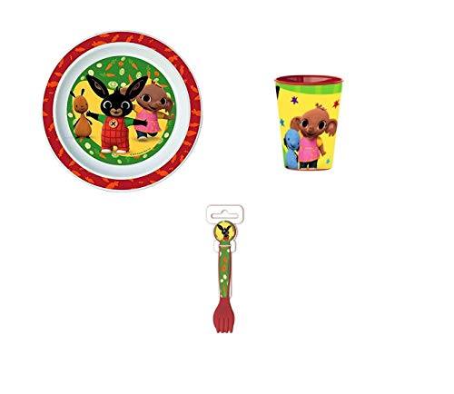 Set pappa a tema Bing composto da un piatto, un bicchiere e due posate. Ottimo regalo per rendere felici i vostri bambini e allegro e colorato ogni pasto! prodotto originale e certificato.