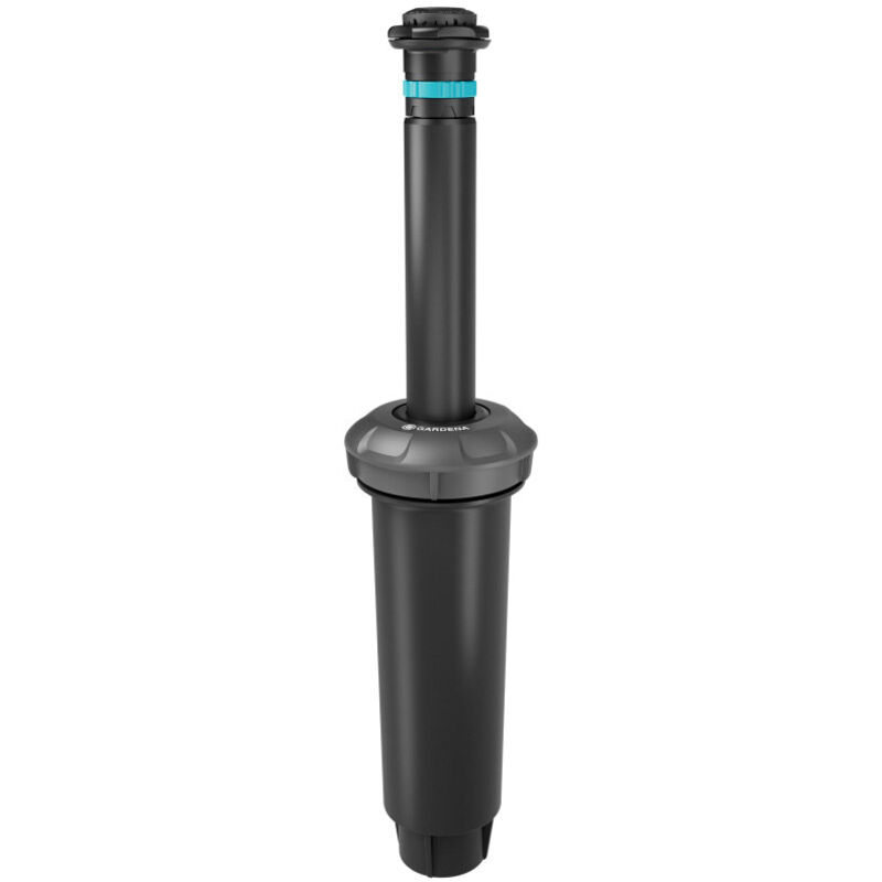 questo fa sì che l'irrigatore scompaia sotto terra dopo l'uso risultando appena visibile in giardino. L'area di spruzzo è regolabile tra 80 e 360° senza l'ausilio di attrezzi, mentre la gittata può essere impostata tra 5 e 7.5 metri. Lo spruzzo avviene tramite una testina rotante, una tecnologia che migliora l'assorbimento d'acqua da parte delle e piante. L'irrigatore emette infatti un getto uniforme che assicura una distribuzione ideale dell'acqua su tutta l'area, permettendo un