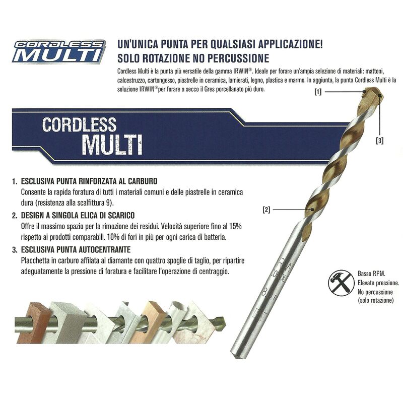 Caratteristiche: 1. ESCLUSIVA PUNTA RINFORZATA AL CARBURO Consente la rapida foratura di tutti i materiali comuni e delle piastrelle in ceramica dura. 2. DESIGN A SINGOLA ELICA DI SCARICO Offre il massimo spazio per la rimozione dei residui. Velocità superiore fino al 15% rispetto ai prodotti comparabili. 10% di fori in più per ogni carica di batteria. 3. ELICA DI SCARICO DEL GAMBO RETTIFICATA Placchetta in carburo affilata al diamante con quattro spoglie di taglio, per ripartire adeguatamente la pressione di foratura e facilitare l'operazione di centraggio.