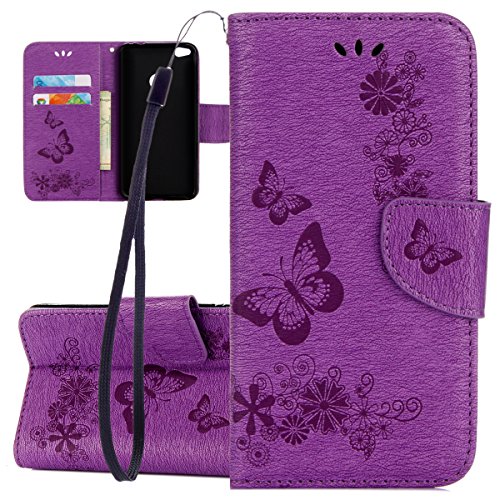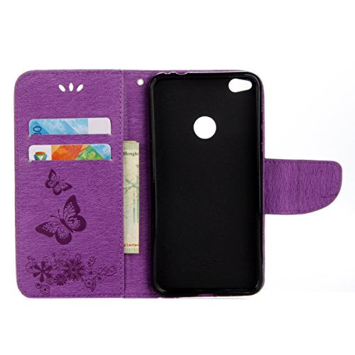 ISAKEN Compatibile con Huawei P8 Lite 2017 Custodia, Libro Sbalzato Embossed Wallet Cover in Pelle PU Protettiva Flip Portafoglio Caso con Supporto di Stand/Carte Slot/Chiusura - Farfalla: Violet