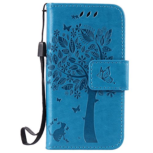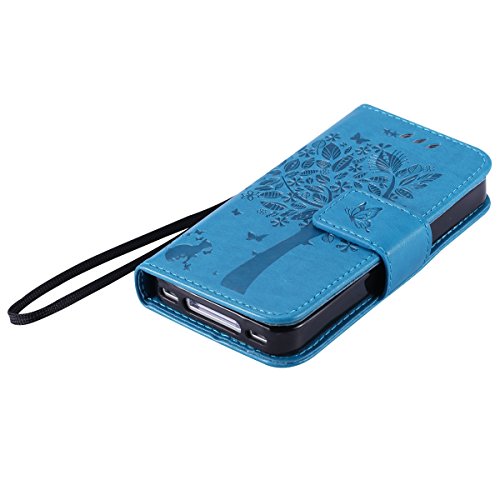 ISAKEN Compatibile con iPhone 4 4S Custodia, Libro Flip Cover Portafoglio Wallet Case Albero Design Tinta Unita Caso in Pelle PU Protezione Caso con Supporto di Stand/Carte Slot/Chiusura - Blu