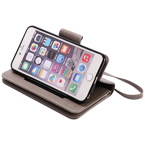 ISAKEN Compatibile con iPhone 6S Plus/iPhone 6 Plus Cover in PU Pelle Portafoglio Tinta Unita Custodia Wallet Flip Case Nove Carte Slots Cover con Supporto di Stand/Strap/Carte Slot, Grigio