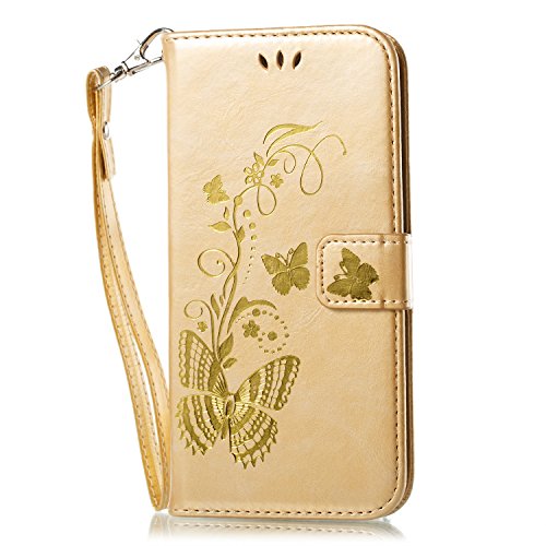ISAKEN compatibile con MOTO G5S Cover in PU Pelle, Bronzing Oro Farfalla Custodia Libro Wallet Flip Portafoglio Cover con Carte di Credito Funzione Supporto Chiusura e Strap, Oro