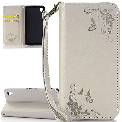 ISAKEN Compatibile con Sony Xperia XA Custodia - Libro Flip Case Portafoglio Wallet Cover in PU Pelle Tinta Unita Custodia Embossed Rose Caso con Supporto di Stand/Carte Slot, Rose: Grigio