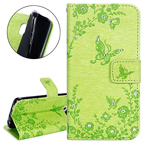 ISAKEN Cover per Samsung Galaxy S6 con Strap Tinta Unita Flip Wallet Bling Glitter Diamante Cover in PU Pelle Portafoglio Custodia con Supporto di Stand/Carte Slot, Diamante: Verde
