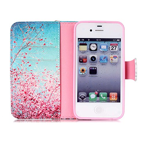 ISAKEN Custodia iPhone 4, iPhone 4S Cover Case, Elegante borsa Custodia in Pelle Protettiva Flip Portafoglio Case Cover per Apple iPhone 4S 4 / con Supporto di Stand / Carte Slot / Chiusura Magnetica (fiori pink)