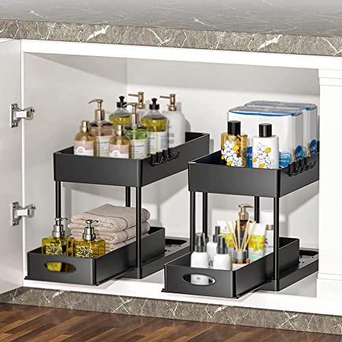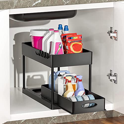 ISAKEN Scaffale Sottolavello Portaoggetti, Organizer Sotto il Lavello a 2 Ripiani con Cassetto Scorrevole, Organizzatore Cestino Portaoggetti per Cucina Bagno Controsoffitto
